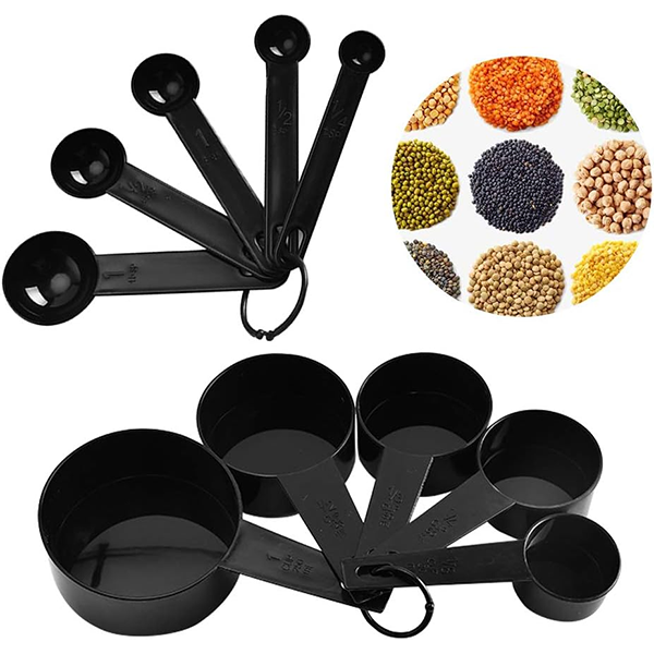 Plastic Measuring Cup and Spoon Set Made of durable and BPA free plastic Snap-together handles. Innovative space-saving design. Dishwasher safe Lightweight construction has easy to read, large print measurements Excellent for maintaining consistent portion control...
